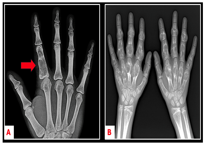 Figure 2. Anterior-posterior (AP) imaging comparing a simple enchondroma of the hand (A) versus the numerous enchondromas found in Ollier Disease (i.e. enchondromatosis, B).